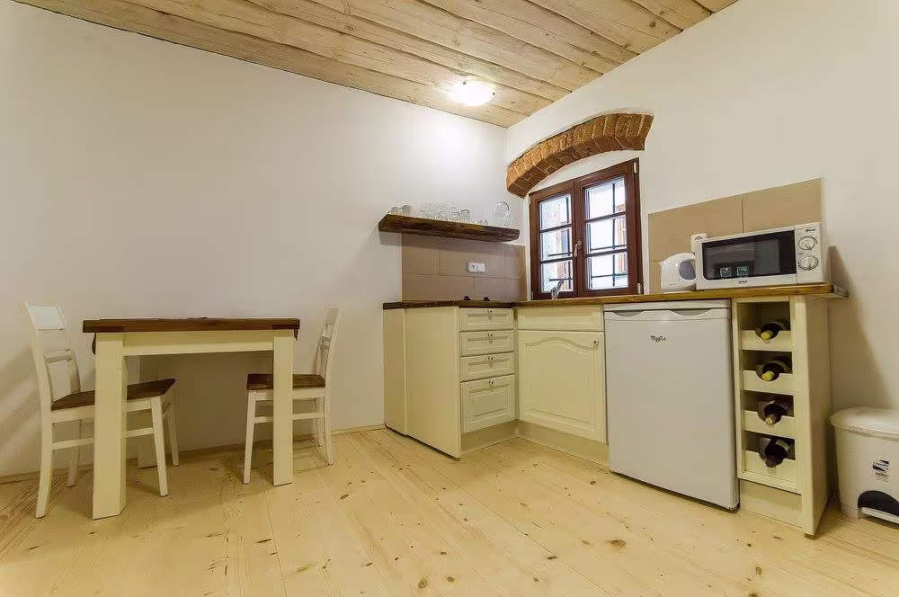Královský apartmán 2 lůžka + přistýlka – 43 metrů čtverečních, plnohodnotně vybavený byt s kuchyní, koupelnou (sprcha) a WC. Apartmán na vás dýchne pradávnou historií našeho penzionu v centru Třeboně. Leží totiž v prostorách bývalé strážní věže z 14. století, najdete v něm třeba historická kachlová kamna nebo nádherný trámový strop. Koupat se budete v prostorách bývalých pecí. Tento apartmán je zařízený tak, abyste se v něm cítili prostě a jednoduše královsky.